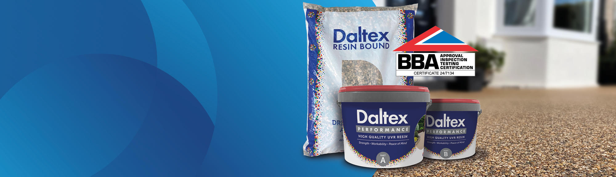 DALTEX UVR resins are suitable for a wide range of dried aggregates, and are formulated to deliver excellent results for driveways, footpaths, garden patios and more external surfaces. DALTEX Bound UV and UV Plus resin is available in two useful size options and is aliphatic UV resistant (UVR).